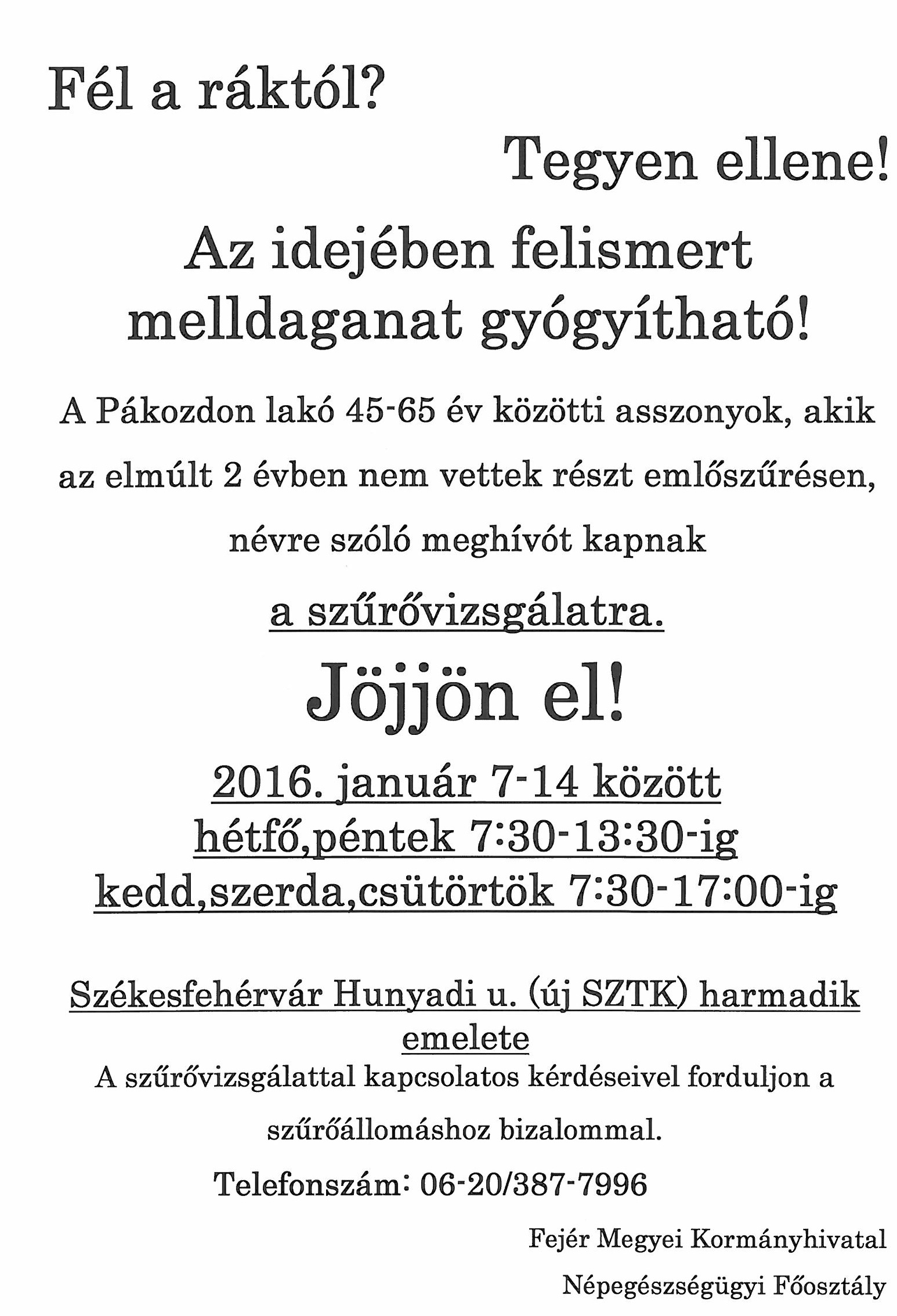 Mammográfiai szűrővizsgálat 45-65 év közötti Pákozdi lakosok számára