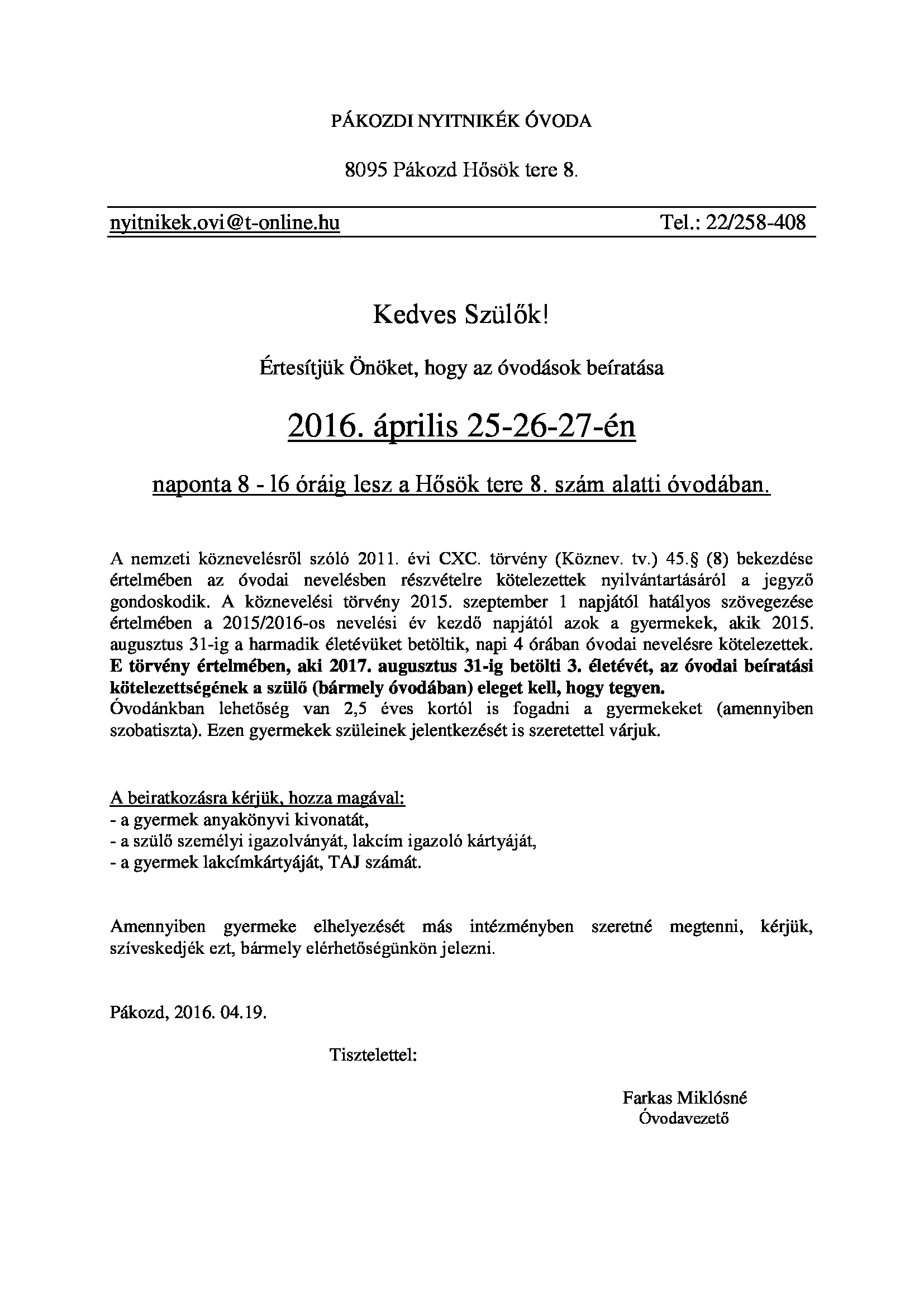 Pákozdi Nyitnikék Óvoda tájékoztatása