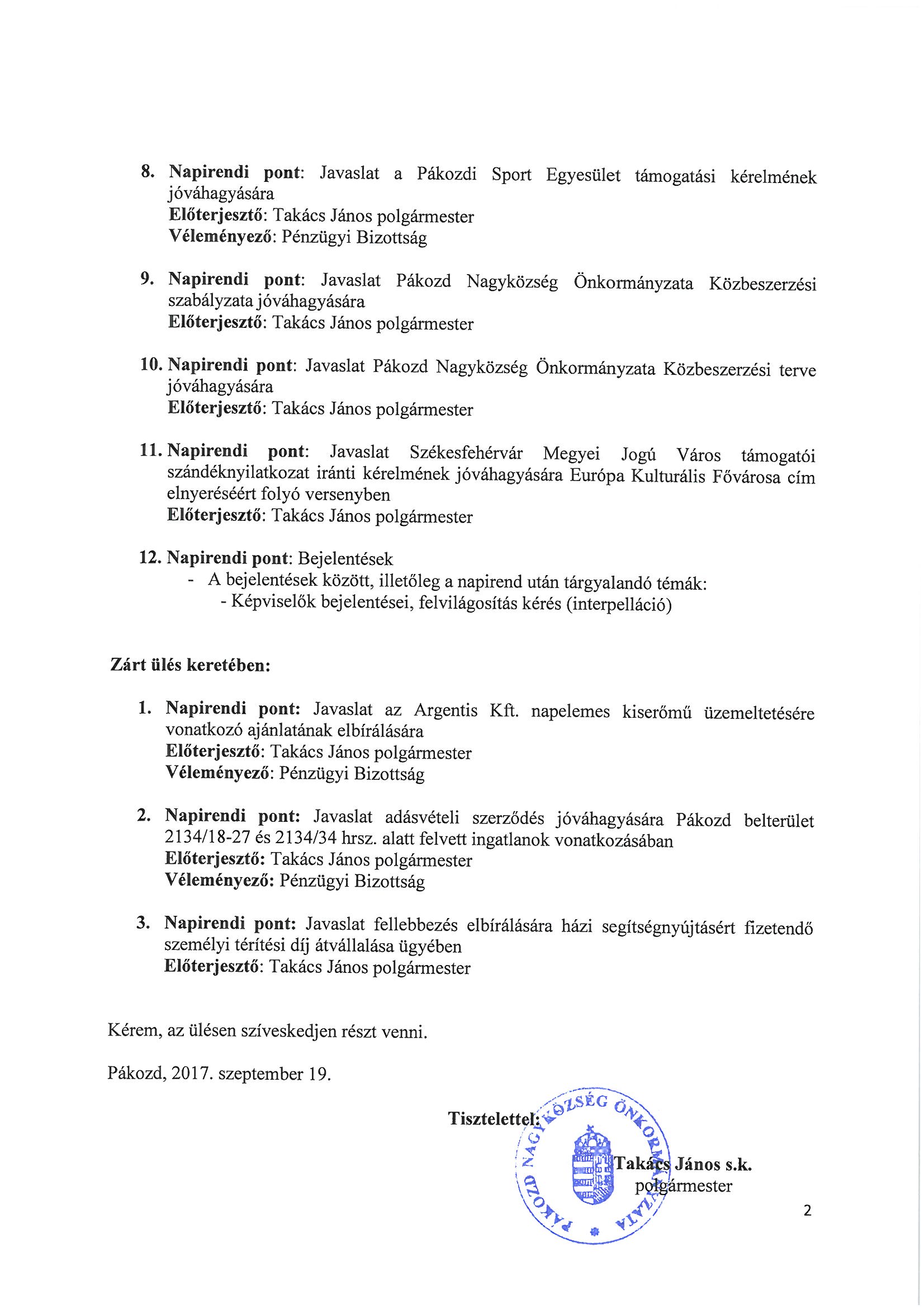 tartja a Pákozdi Polgármesteri Hivatalban, melyre ezúton tisztelettel meghívom.