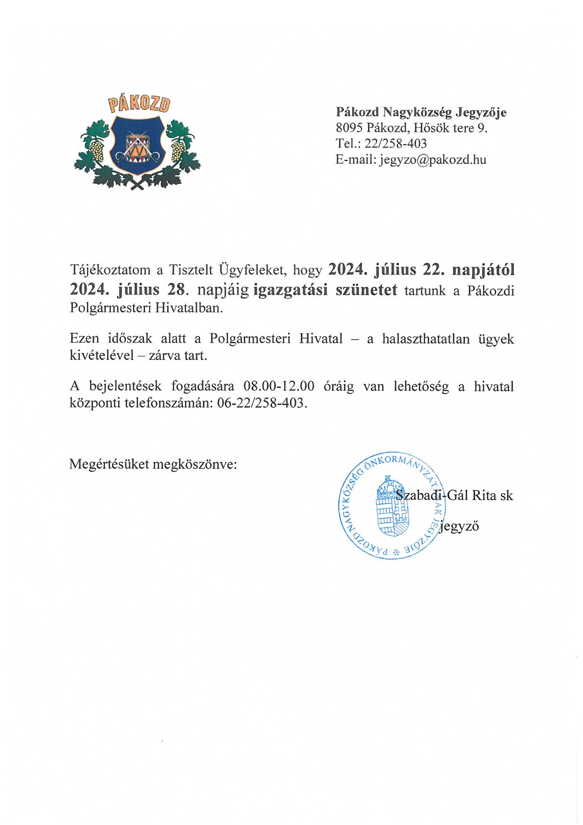 2024.07.16. Tájékoztatás védőnői szabadságról Tisztelt Lakosság, Kedves Szülők! 2024. július 22-26.-ig Rausch Zsófia védőnő szabadságát tölti. Ez idő alatt Sukorón, Bédné Molnár Hajnalka helyettesíti Őt. Szíves megértésüket és együttműködésüket köszönjük! Részletek
