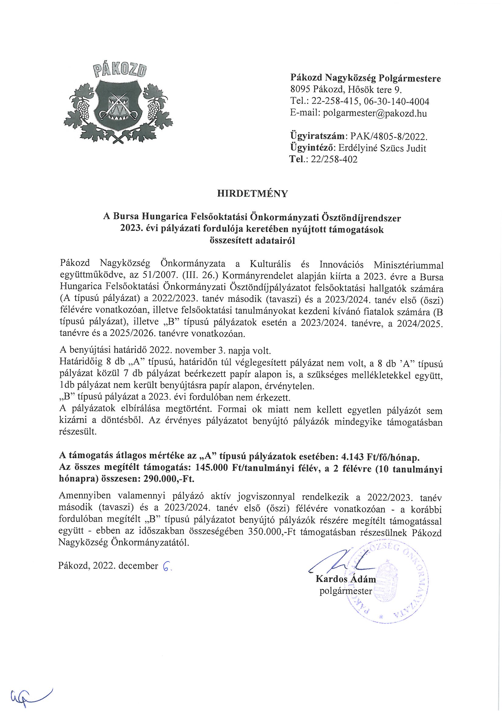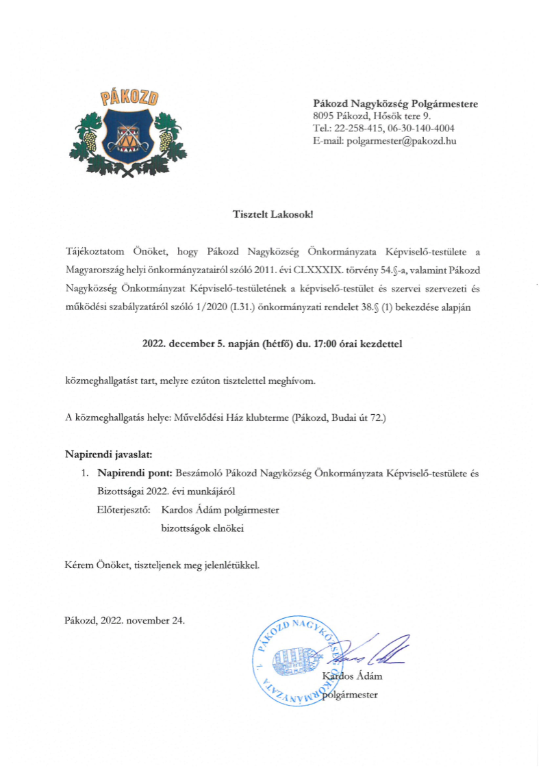 2023.01.26. Meghívó Pákozd Nagyközség Önkormányzata Képviselő-testülete következő rendes ülését 2023. január 30-án 16:00 órakor tartja a Pákozdi Polgármesteri Hivatalban, melyre ezúton tisztelettel meghívom. A meghívó a következő linken érhető el. Részletek