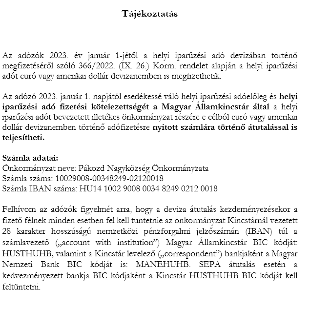 2023.02.13. TÁJÉKOZTATÁS Tájékoztatás a helyi iparűzési adó devizában (euró vagy amerikai dollár) történő megfizetésről Tájékoztatás az alábbi linken érhető el. Részletek