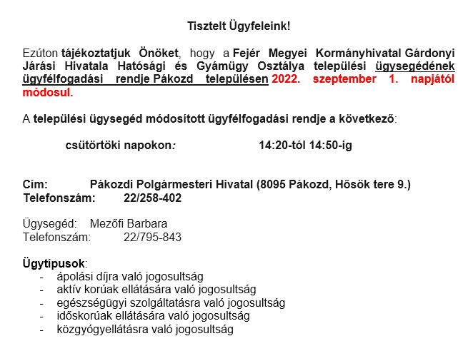 2022.05.27. Meghívó Pákozd Nagyközség Önkormányzata Képviselő-testülete következő rendes ülését 2022. május 30-án 16:00 órakor tartja a Pákozdi Polgármesteri Hivatalban, melyre ezúton tisztelettel meghívom. A meghívó a következő linken érhető el. Részletek