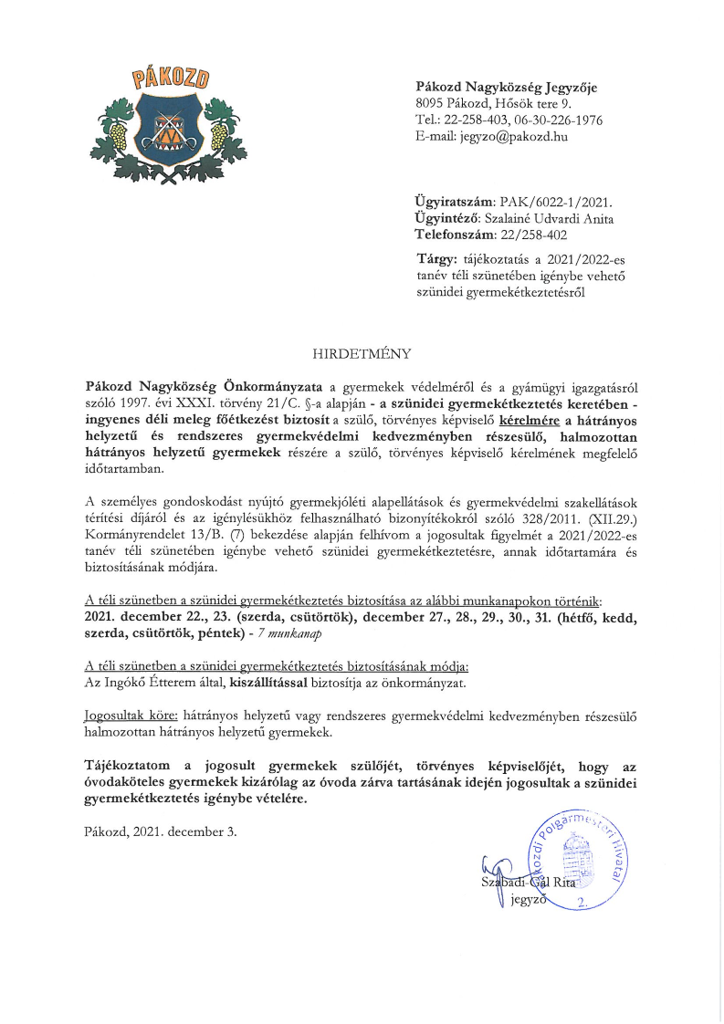 2021.10.05. Tájékoztatás szociális célú tűzifa igénylésről Tájékoztatás szociális célú tűzifa igénylésről. Tájékoztatjuk a Tisztelt Lakosságot, hogy a 2021. évi fűtési időszakban ismét igényelhető a szociális célú tűzifa támogatás. Mellékletek: Tájékoztató szociális célú tűzifa igénylésről Kérelem Részletek