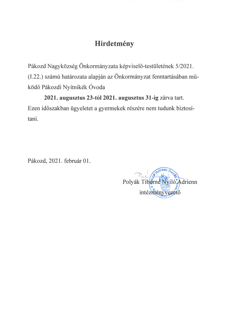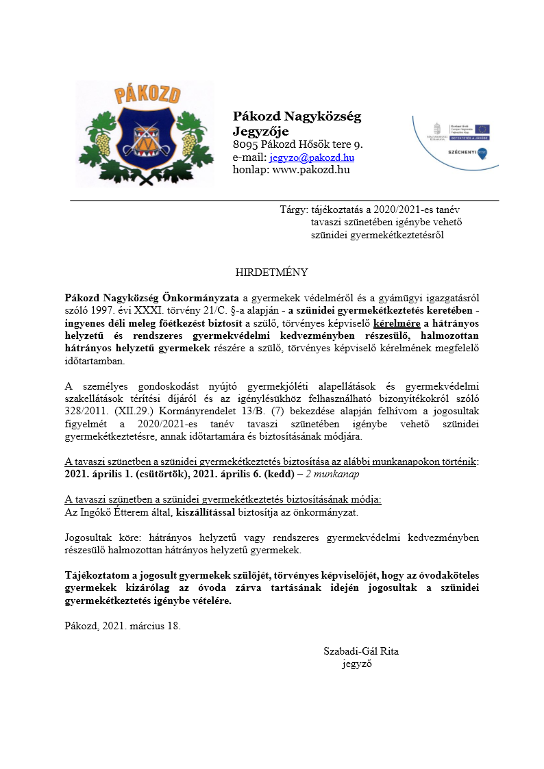 2021.03.18. TÁJÉKOZTATÁS Tájékoztatás Óvodai beiratkozás időpontjáról !! További információ az alábbi linkre kattintva olvasható. Részletek
