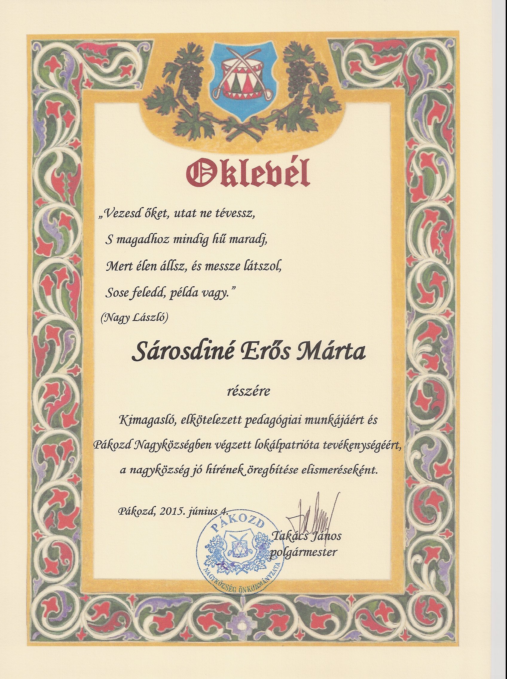 Takács János polgármester oklevéllel köszönte meg Sárosdiné Erős Márta és dr. Németh Attiláné kimagasló, elkötelezett pedagógiai munkáját és a nagyközségért végzett lokálpatrióta tevékenységét.