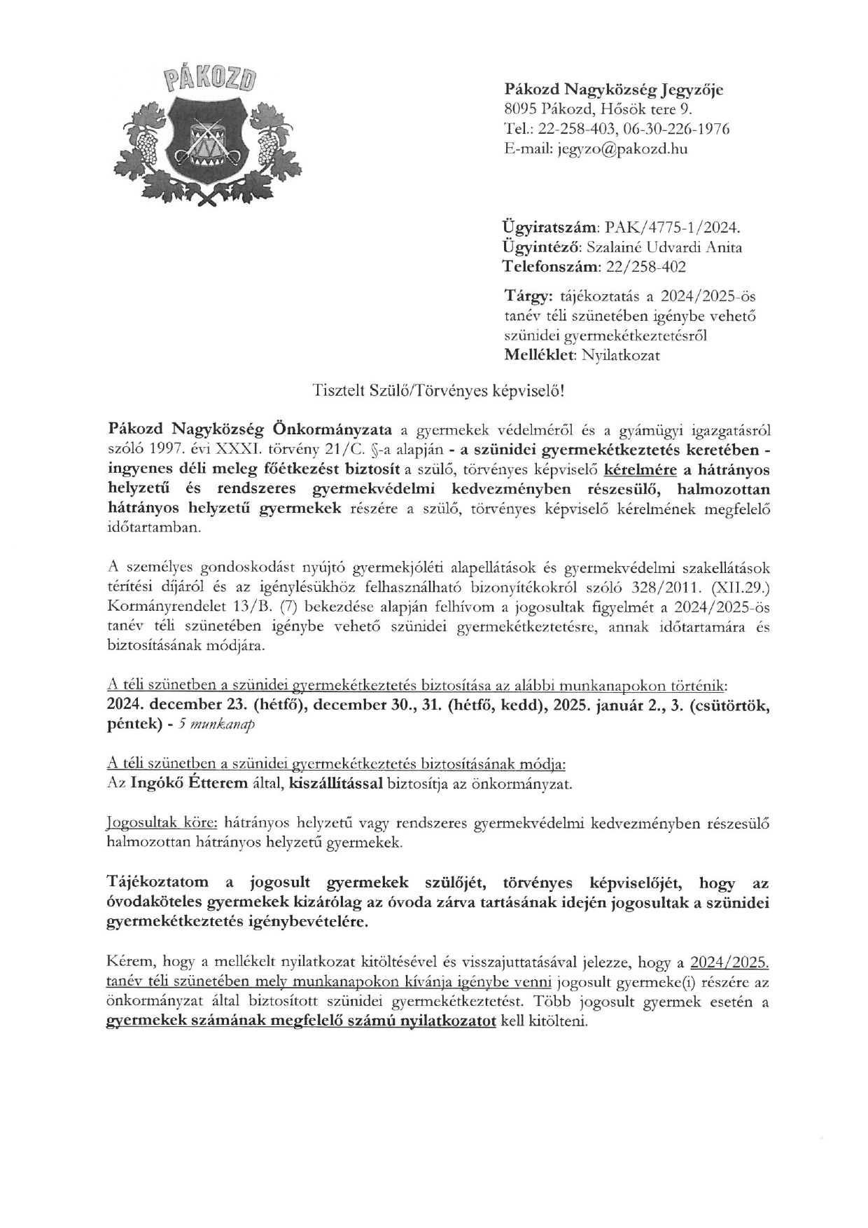 Tájékoztatom a tisztelt ügyfeleket, hogy a Pákozdi Polgármesteri Hivatalban igazgatási szünet miatt 2024. december 23-tól 2024. december 31.-ig az ügyintézés szünetel.