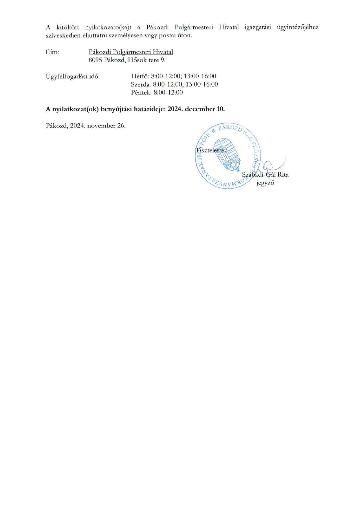 Pákozd, 2024. december 16. Kardos Ádám s.k. polgármester