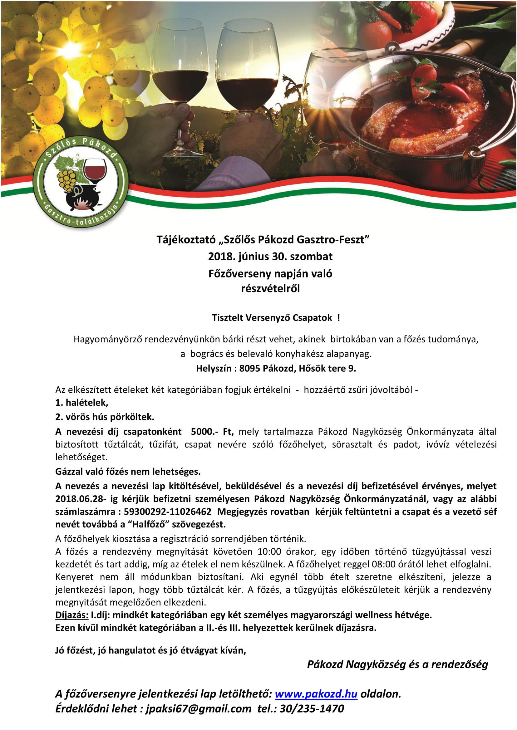 2018.06.26. A" Szőlős Pákozd Gasztro-Feszt"-en a főzőverseny jelentkezési határideje: 2018.06.28!!!!! Részletek
