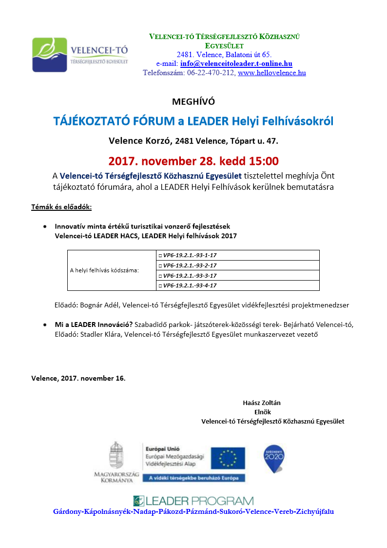 2017.11.20. Meghívó 2017. november 21. Meghívó Tájékoztató Fórum a Leader Helyi felhívásokról 2481 Velence , Tópart u. 47. 2017. november 21. Kedd 10:00 Részletek