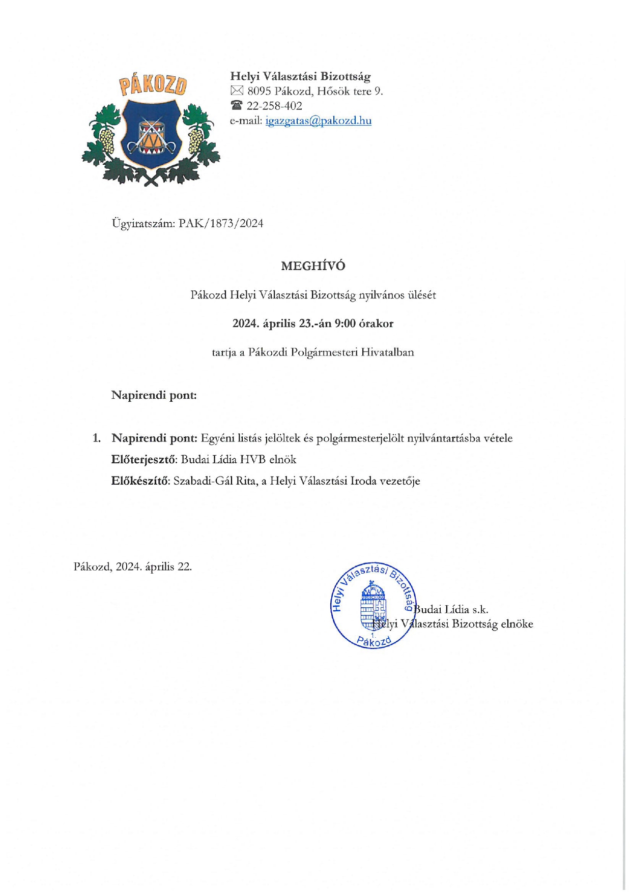 A Helyi Választási Bizottság elnöke tisztelettel meghívja Önöket a 2024. április 23.-án tartandó níyilvános ülésre: